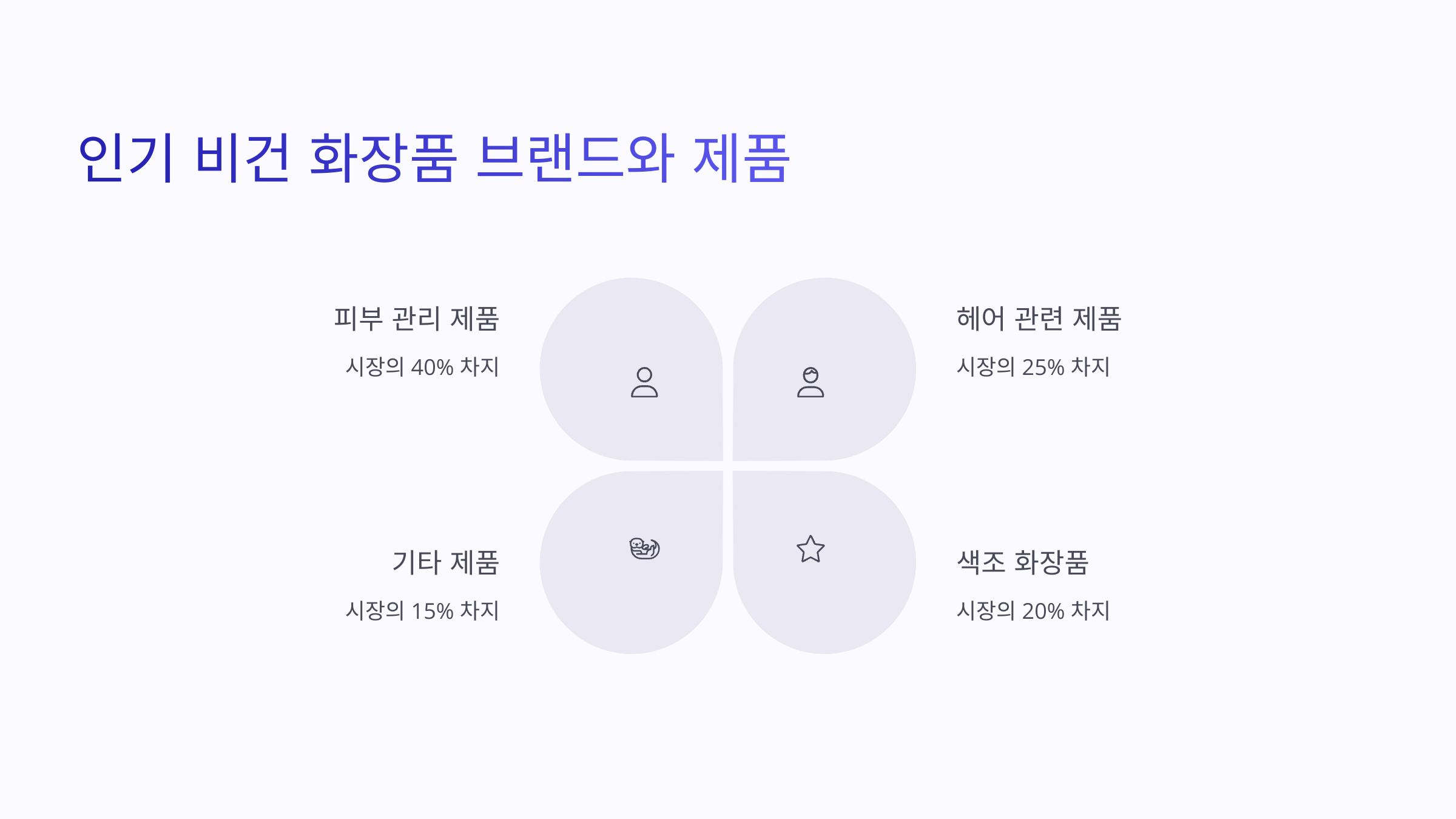 비건 화장품 시장이 성장하면서 다양한 브랜드들이 비건 제품을 출시하고 있어요. 초기에는 기초 제품(크림, 팩, 립밤 등)이 주를 이뤘지만, 이제는 쿠션, 아이라이너 등 색조 제품까지 종류가 다양해지고 있답니다. Fortune Business Insight에 따르면 글로벌 비건 뷰티 시장에서 피부 관리 제품이 약 40%로 가장 큰 비중을 차지하고, 헤어 관련 제품이 약 25%, 색조 화장품이 약 20% 정도를 차지한다고 해요. 특히 젤, 파우더, 크림 형태의 색조 화장품이 가장 높은 성장세를 보인다고 합니다!