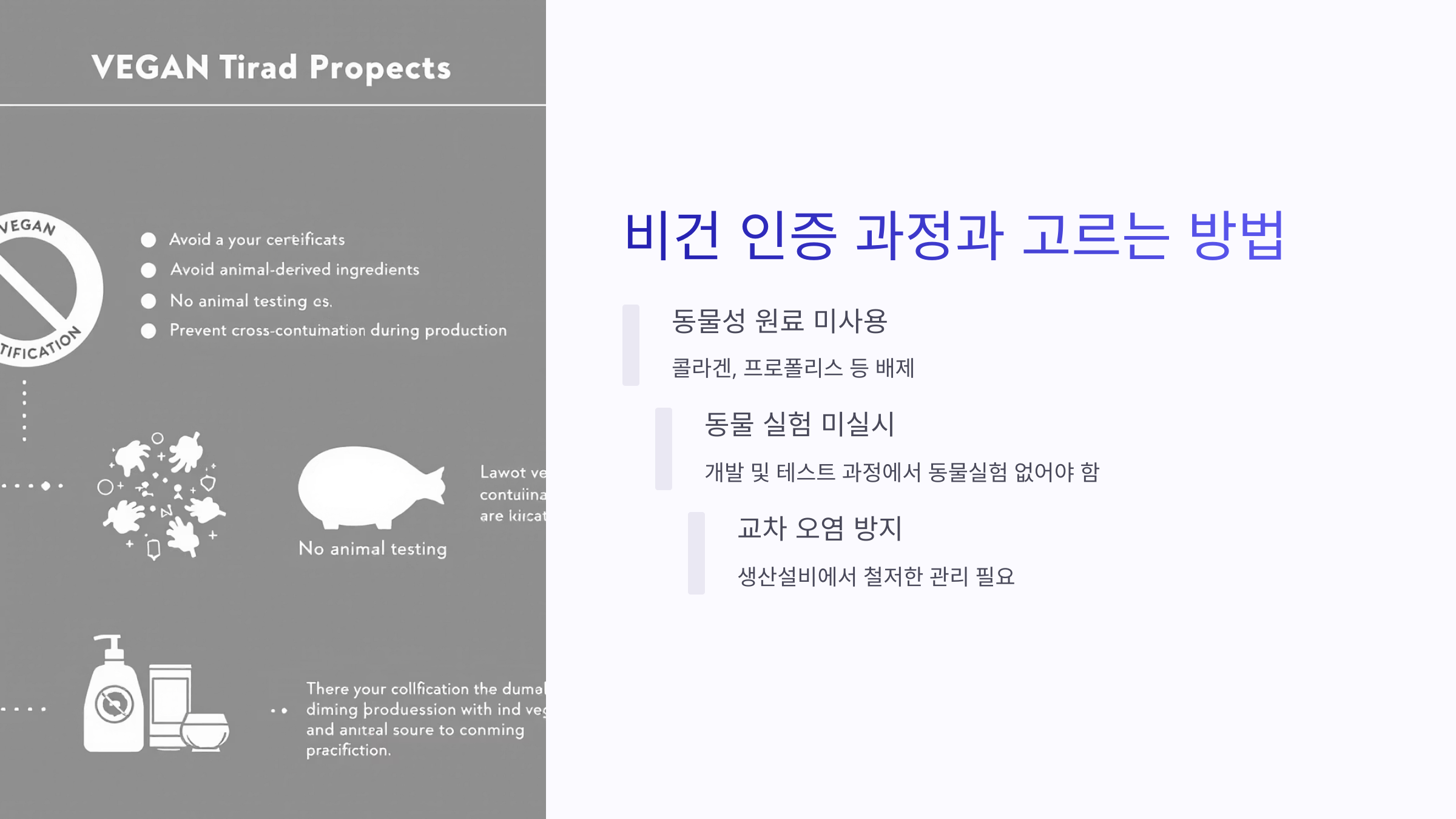 - 생산설비에서 교차 오염의 위험이 없을 것- 비건 제품과 비비건 제품을 같은 생산라인에서 만들 경우, 교차 오염을 방지하기 위한 철저한 관리가 필요합니다.