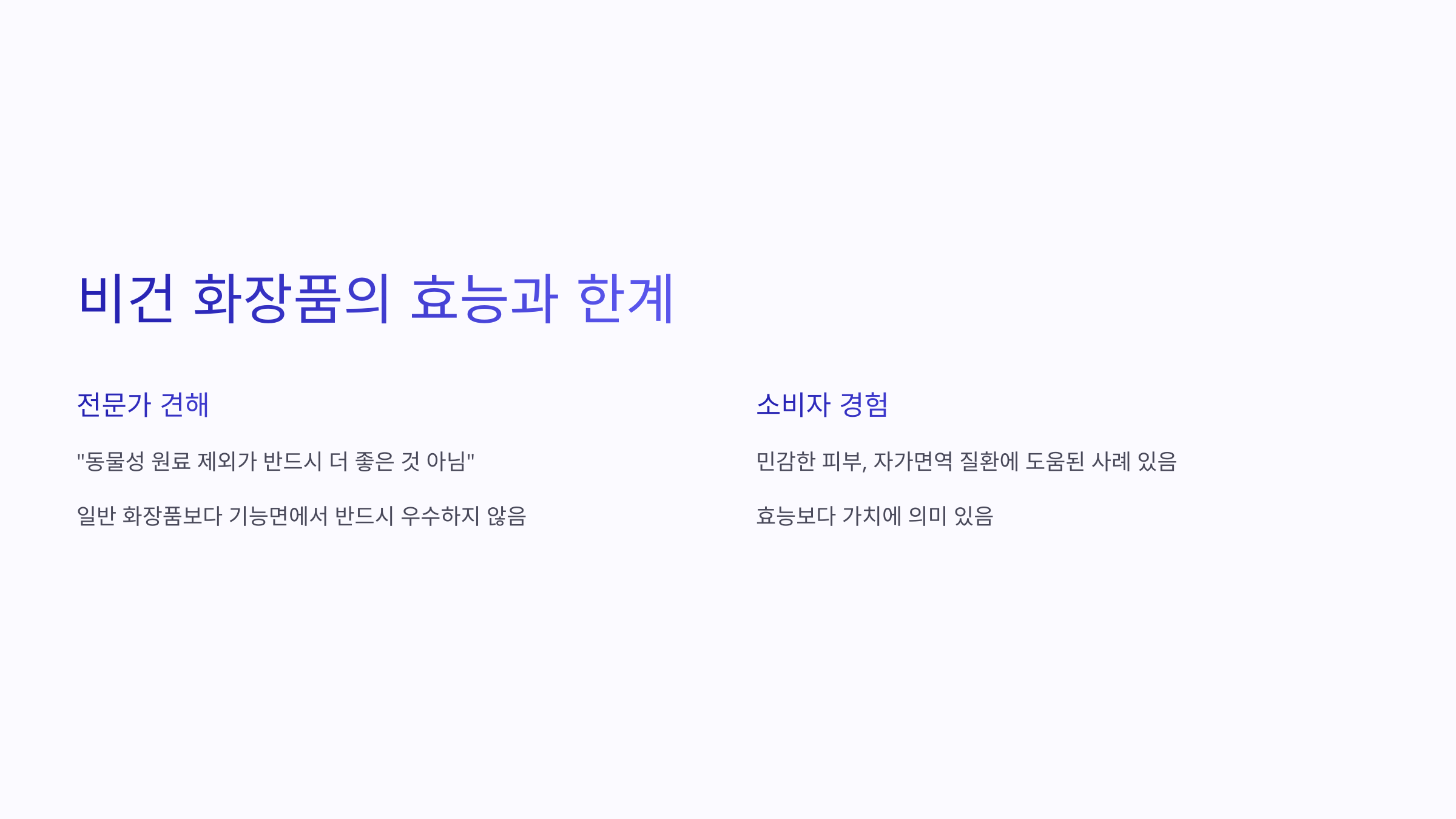 "저는 제품이 비건이라는 이유만으로 구매 결정에 영향을 받지는 않아요. 제품의 효능과 '클린 뷰티' 포뮬레이션이 더 중요하다고 생각합니다." - Reddit 사용자 B